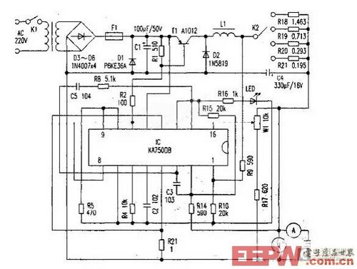 输出电流由K2选择控制,如果要输出电流大于1.5A,需增加T1的散热片面积,并将L1的线径加粗。其改制的难点是制作电阻:R18、R19、R20、R21。笔者通过查询得知φ0.13mm漆包线的阻值是1322Ω/km;φ0.21mm的漆包线阻值是506Ω/km,再经计算得出以上电阻所需漆包线长度后,绕制在圆柱形绝缘体上,并在调试中根据输出电流大小修剪漆包线的长度。