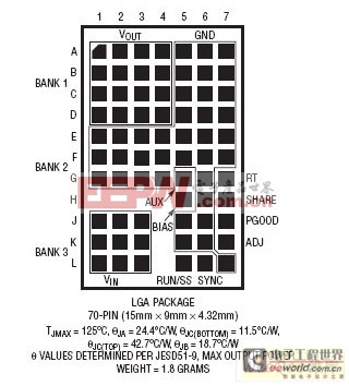 LTM8025 采用耐热增强型的紧凑 (15mm x 9mm)、扁平 (高度仅 4.32mm) 模压树脂焊盘网格阵列 (LGA) 封装,适合采用标准的表面贴装设备来进行自动化装配。LTM8025 符合 RoHS 标准。