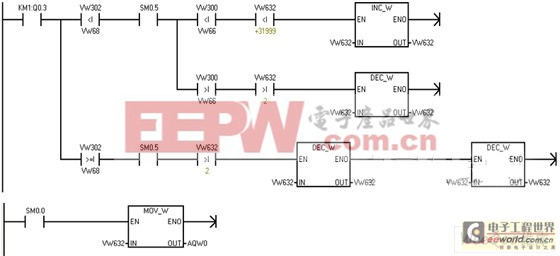 梯形图程序中VW302为电压显示值寄存器,VW68为电压设定值寄存器;VW300为电流显示值寄存器,VW66为充电电流设定值寄存器;VW632为模数转换数字量暂存器。Q0.3闭合表示充电,当电池组电压值VW302小于设定值VW68且电流值VW300小于设定充电电流值VW66,模拟量输出值VW632不断增大到充电电流等于设定电流值为止(VW632最大值为31999);反之,VW632值不断递减。当充电电压高于设定的电压值时,模拟量输出值不断递减,保证充输出电电压不高于设定的电压值。