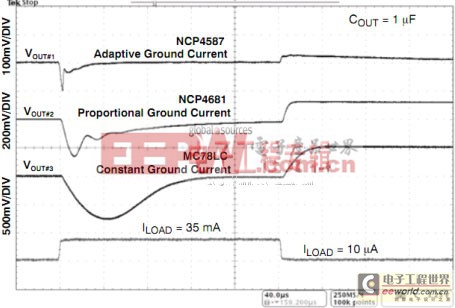 图4显示了上述三类超低IQ LDO的接地电流与输出电流对比图。比较中使用的所有LDO都具有在1 μA至1.5 μA之间的极相近静态电流规格。它们的接地电流与输出电流的相关关系大为不同。因此,这些稳压器的动态性能也差异极大。NCP4587作为自适应偏置LDO,其负载瞬态性能优势很明显。三款器件的瞬态幅度比较如图5所示。