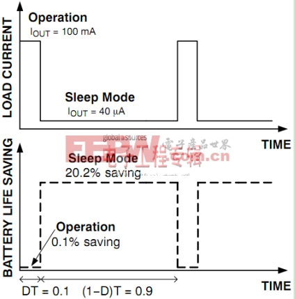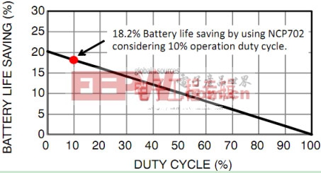 LDO输出电流极少保持恒定,我们可以扩展研究范围,考虑负载电流变化的情况。通常在这类应用中,采用LDO稳压器供电的电路会在休眠模式与工作模式之间转换。例如,图8显示了占空比为10%的某应用的负载电流特性。负载在休眠模式下消耗40 μA电流,工作模式下电流消耗为100 mA.在输出电流为40 μA时,NCP702将增加11.1 μA的接地电流,故总电池电流为51.1 μA.相同输出电流时,LDO竞争器件增加的接地电流为21.4 μA,相应消耗的总电池电流为61.4 μA.两者之间相差20.2%.这表示在休眠模式下NCL704能节省电池电量消耗。图9显示的则是NCP702在不同占空比时能够节省的电池电量。