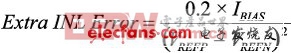 由于放大器为外置型,可根据噪声、温度漂移和速度的优化需要进行选择——并可调整比例因子——具体视应用需要而定。对于基准缓冲,建议采用AD8676 双通道放大器,其具有低噪声、低失调误差、低失调误差漂移和低输入偏置电流的特点。基准缓冲的输入偏置电流特性非常重要,因为过大的偏置电流会降低直流线性度。积分非线性度的降低(单位:ppm)为输入偏置电流的函数,一般表示为: