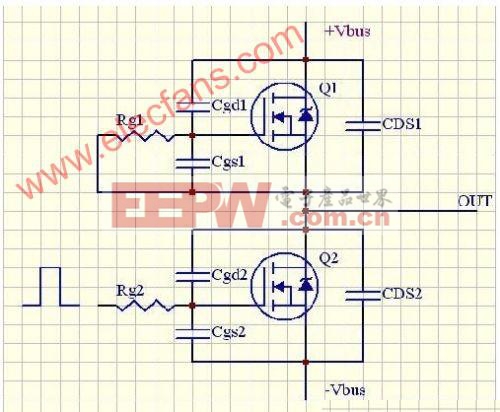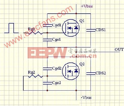 用正驱动脉冲开启Q2,当栅电压达到门坎时;Q2开始通。Cds2短路放电;Cds1充电。显然;Q2是硬开通。Q1此时开始实质性承受电压。由于Cdg1的充电;导致在Q1驱动栅电阻上产生电压。当感应电压达到门坎时;Q1/Q2瞬间发生上下直通。