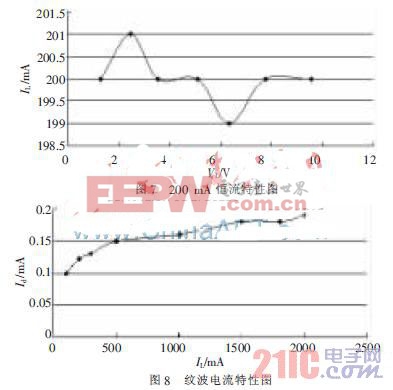在给定电流200 mA作用下,负载稳定度曲线图如图7所示,其中负载稳定度是指一定的工作情况下,负载变化引起的输出电流变化。测试数据表明负载电压在0~10 V变化时,输出电流最大偏差为2 mA,满足输出电流绝对值小于输出电流值的1%的设计要求。