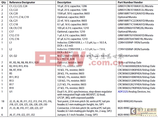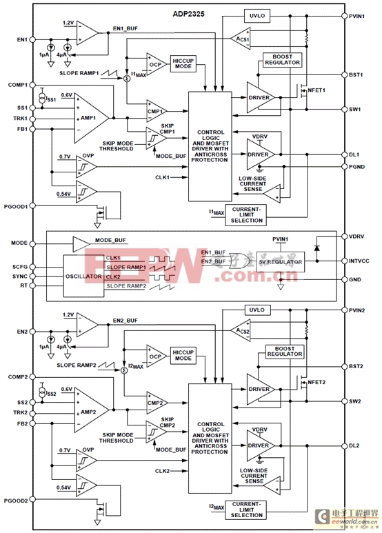 ADI公司的ADP2325是双路5A 20V同步降压DC/DC稳压器,集成了两个高边功率MOSFET和两个用来驱动外接N沟MOSFET的低边驱动器.两个PWM通路可配置成两路5A或10A输出,输入电压4.5V到20V,输出电压低至0.6V,主要用在通信设备,网络和服务器,工业和仪表,医疗保健等.本文介绍了ADP2325主要特性,功能方框图,多种典型应用电路,以及评估板ADP2325-EVALZ主要特性,电路图,材料清单和PCB元件布局图.