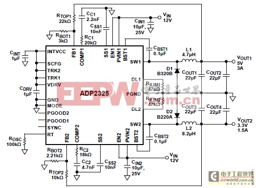 图3.ADP2325采用外接二极管的应用电路图:VIN1 = VIN2 = 12 V, VOUT1 = 5 V, IOUT1 = 3 A, VOUT2 = 3.3 V, IOUT2 = 1.5 A, fSW = 600 kHz