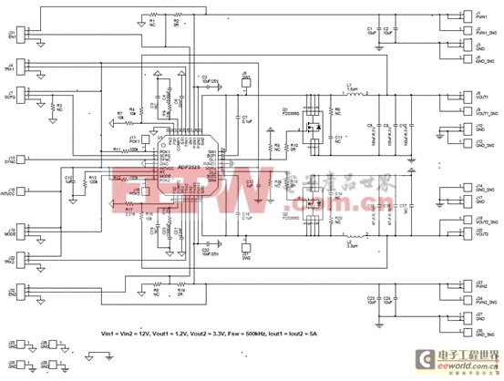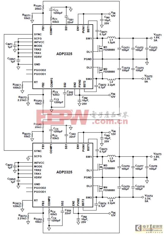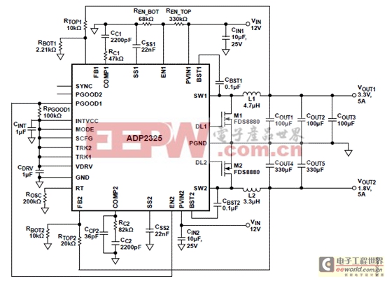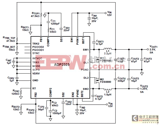 图2.ADP2325采用外接MOSFET的应用电路图:VIN1 = VIN2 = 12 V, VOUT1 = 1.2 V, IOUT1 = 5 A, VOUT2 = 3.3 V, IOUT2 = 5 A, fSW = 500 kHz