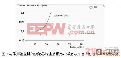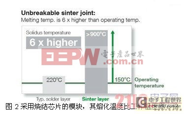 过去,焊料是将半导体芯片附着和互连到基板的首选材料。然而,焊锡合金因其熔点只有220℃,在实现更高芯片工作温度方面有局限。在SKiiP?4模块中,硅芯片和DCB基板之间的焊接层完全被烧结层所取代。有了这一连接技术,芯片首次被放置在银涂层上,并在其上施加压力,以在DCB和芯片之间建立一个永久的连接。这一薄银层的的热阻比焊接连接小且熔点较高,达960℃,这就是为什么可以避免过早材料疲劳的原因。银连接是坚固的,熔化温度比焊接连接高6倍(图2)。与采用焊接芯片的模块相比,半桥具有更高的负载循环能力。