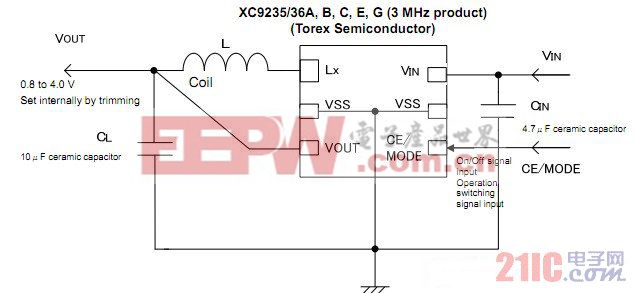 特瑞仕半导体公司的XC9235/XC9236/XC9237系列产品,内置了采用P沟道MOSFET和N沟道MOSFET输出电流驱动器的降压同步整流型DC/DC转换器。由内部的IC来决定为稳定工作所需要的电路定数,外置零部件只需要产品目录中记载的输入和输出电容及线圈即可工作,是一体集中型DC/DC转换器。能提供高达600mA的输出电流。(参照图1)