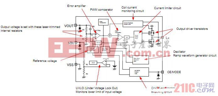 内部电路由基准电压、误差放大器、振荡器、指示灯波形、PWM比较器、UVLO、限定电流电路等构成,固定输出电压型由激光微调固定调整了内部电阻RUR2的电阻比.工作电压范围在l.8V--6V之间,此外,内部调整了放大器的相位补偿及送信频率、软启动时间等,可以完全无须调整地使用。