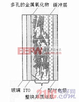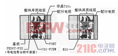 对反向电流的抑制,如图5所示,藉设置金属氧化物薄膜能予以改善。在负极的铝与整块异质结薄膜间,设置非晶的氧化钛,能抑制从负极空穴的漏泄。这一氧化钛薄膜相对于π共轭高分子,作为电子受体功能,不仅有防止逆电流的作用,而且能改善电荷的生成。另一方面,在正极侧将氧化镍薄膜设置在电极与整块异质结薄膜之间,则能抑制电子的漏泄。氧化镍的厚度10nm最佳。详细的机理研究等尚不充分,有待今后验证。
