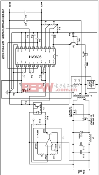 HV9606组成的1.5W隔离型反激变换器实际电路如图3所示,输入电压为48V,输出电压为3.3V,输出电流可达20A的隔离型正激变换器实际电路如图4所示。
