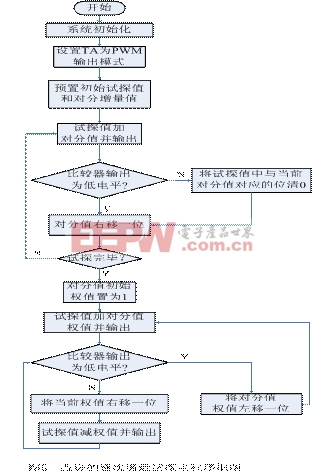 为了能够缩短试探时间提高在高分辨率下的采样速度,采用改进的逐次逼近的对分试探法使得试探值能够迅速逼近被测模拟量。常规的对分试探法是每次试探开始时,首先将最大计数值的一半(即字长对分值)作为试探初值并将其转换成PWM信号输出,相当于输出1:1占空比的PWM脉冲信号,然后测试比较器的状态,以确定当前试探值的大小,若试探值小于被测模拟量,则保留当前试探值,否则去掉,然后再将剩余值的一半(即:剩余对分值)作为新的增量与上次保留值相加后产生新的试探值并将其转换成PWM脉冲信号输出,再测试比较器的状态,若大于被测模拟量,则去掉当前增量,否则保留,随后每次的输出都将剩余对分值作为增量进行试探,一直持续的试探下去,直到试探完与分辨率相当的次数,例如:实现具有16位分辨率的A/D转换就要试探16次由于该方法在采样时无论当前采样值试探值多么接近被测值,其每次采样的试探次数都相同,为减小试探次数提高采样速率,在本设计中采用了一种改进的逐次逼近试探算法,可大大减少试探次数,其具体实现的方法是:当第一次试探完并获得采样值后,保留当前采样值,不再以剩余对分值作为新的增量,而是以最小值作为初次增量(即:将最低位置1,可将其看作权值),与上次保留值相加并转换成PWM信号输出,通过测试比较器输出确定当前增量值是否需要保留,若试探值小于被测模拟量,则保留当前试探值,否则去掉。若需要增大试探值时,则可将权值左移一位再与上次试探值相加,以形成新的试探值,这样可以使逐次逼近试探值总处在跟踪试探状态,从而大大减少了试探次数。由于在实际测试过程中被测模拟量一般很少有突变情况发生,大都处在缓变增加或缓变减小状态,因此采用这种改进的逐次逼近的试探算法,将会有效的提高A/D转换器的采样速率。