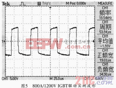 图5是示波器采集到的所设计电源的IGBT驱动波形。