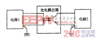 切断两电路单元之间地环流的另一种方法是采用光电耦合器,如图1-10所示,其原理是发光二极管发光的强弱随电路1输出信号电流的变化而变化,强弱变化的光使光敏晶体管产生相应变化的电流作为电路2的输入信号。将这两种器件封装在一起就构成了光电耦合器。