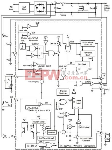 电路采用SO8封装结构,实现了外部组件数量的最小化并极大简化了PFC设备。它还具有高安全性保护特性,使得NCP1654成为一个用于耐用、紧凑型PFC控制器的驱动器,就像一个高效的输入电源失控箝位电路。