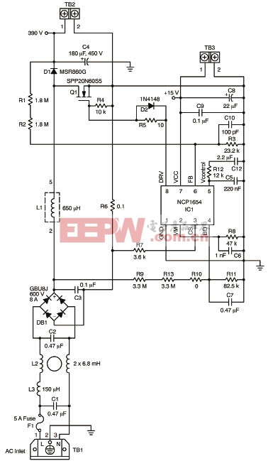 图2 NCP1654应用电路:300W 65kHz功率因素修正电路