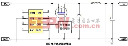 当主电路的供电电压不太高时,可插入图二所示的电平转换驱动电路。这种方法的优点是成本较低,缺点一是当输入电压Vin较高时不易处理好;二是电平移动驱动部分需要电荷泵供电,因此电路比较繁复。