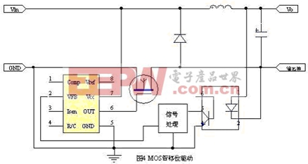 如图四所示,将MOS管移到供电电源的负端,就可用IC输出的信号直接驱动。优点是驱动成本低,缺点一是输出地悬浮,抗干扰性差;二是不能直接引进反馈,需要再加光耦隔离传送。