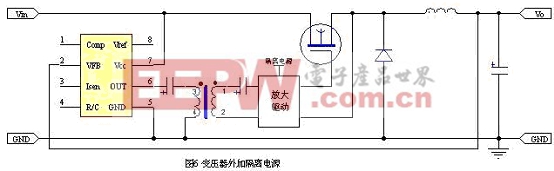 图5所示这种直接驱动方法的突出优点是成本最低,但由于变压器只能传递交流信号,因此输出的正负脉冲幅值随占空比而变,只适用于占空比在0.5左右、而且变化不大的情况。同时由于变压器的负载是MOS管的输入电容,驱动脉冲的前后沿一般不会很理想。