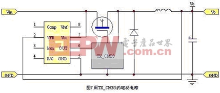 图7示出的是采用TX_CMB3型驱动模块的斩波电路,该驱动组件是北京落木源公司(www.pwrdriver.com)新开发出的单管隔离驱动器。该款驱动器使用变压器隔离,采用分时技术,在输入信号的上升和下降沿传递PWM的信号,在平顶阶段传递能量,因而能够输出陡峭的驱动脉冲。这种驱动方法的优点是使用方便(在MOSFET功率不大时,只要如图7连接就可以了),驱动脉冲质量好,工作频率高,体积较小,输入电压最高可达1000V,价格也比较便宜。缺点是工作频率低时要求的变压器体积比较大,同时成本稍高些,但考虑到简化了设计、并降低了装配成本,总成本可能还要低些。