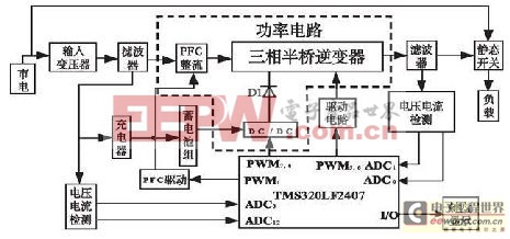 PWM前端控制整流由于具有直流电压的变化,输入功率因数校正(PFC)和输入电流谐波控制的能力等优点,被广泛用于三相交直交电压系统。由前端整流器、直流电容,以及逆变器组成的三相交直交电压系统广泛用于在线式UPS。基于DSP控制的在线式UPS的结构图如图1所示。