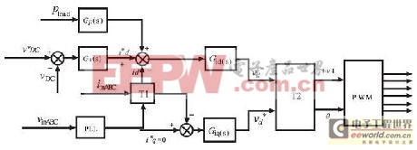 图1中,主电路由输入变压器、输入滤波电路、电压和电流检测电路、蓄电池、功率电路、输出滤波电路和静态开关等组成。其中功率电路包括三个部分,即输入的PFC、三相全桥逆变器、DC/DC部分。电路信号采用TMS320C2812控制。该控制器是TI软件公司开发的,可方便地进行汇编,执行控制程序和错误检查。一般PFC升压整流控制器通常有两个反馈回路,外部电压环路和内在电流环路。电压调节器产生电流控制的d轴电流,而在q轴电流控制是零的单位功率因数,其控制如图2所示。