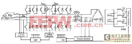 一个标准的基于DSP控制在线式UPS系统如图3所示。系统由推动型的前端整流器、直流链接、电压源逆变器构成。这两个功率转换器使用标准的空间矢量PWM控制,产生快速电压调节与总谐波失真最小化控制逆变器。