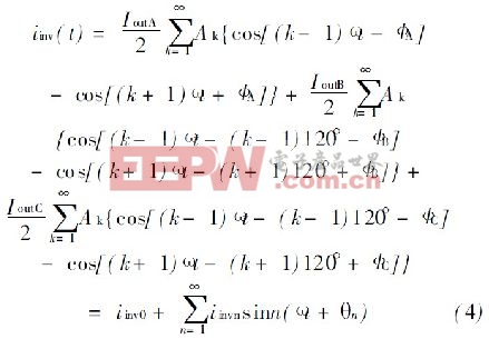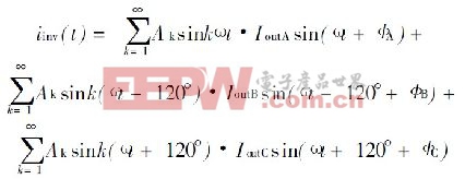式中,Iinv0是直流分量的逆变器输入电流;Iinvn是n阶部分的电流。通过公式(4)可看到,IoutA=IoutB=IoutC和ΦA=ΦB=ΦC,同时有Iinvn=0,如果n>0三相负载电流是平衡的。否则,交流成分存在会造成连锁反应。