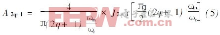 式中,q=0,1,2,……∝;ωm是调制频率;ωc是载波频率;ωm≤ωc,a是调制指数;Jv(z)是第一类Bessel函数。公式(5)只适用于频率范围远远低于载波频率,此时在一次波段的载波频率可以忽略不计。在本文的系统研究中,m/c=1/90适用于规定计算,并假设调制指数:A1=1,A3=1.142×10-4,A5=3.020×10-8.