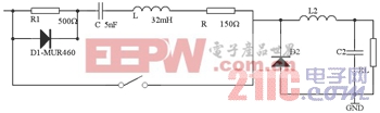 在开关控制电源的输入部分加入缓冲电路(见图3),其由线性阻抗稳定网络组成,用于消除电力线干扰、电快速瞬变、电涌、电压高低变化和电力线谐波等潜在的干扰。缓冲电路器件参数为D1为MUR460,R1=500Ω,C=6nF,L=36mH,R=150Ω。