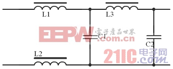 图5是开关电源的直流输出侧滤波电路,它由共模扼流圈L1、L2,扼流圈L3和电容C1、C2组成。为了防止磁芯在较大的磁场强度下饱和而使扼流圈失去作用,磁芯必须采用高频特性好且饱和磁场强度大的恒μ磁芯。