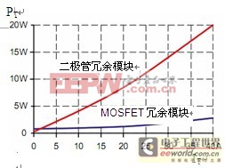 MOSFET冗余模块的优点不言而喻。MOSFET的导通电阻较低,使得电压降远远低于使用二极管时的电压降。输出电流为40A时,YR80.241输入端和输出端的差异仅为50mV。如图3所示。使用传统的二极管模块时,电压降至少为500mV。同样,二极管的功率消耗至少升高10倍,并且需要大型散热器进行冷却。如图4所示。MOSFET冗余模块YR80.241在输出电流为40A时,功率损耗仅为2.7W。这不仅包括MOSFET的功率损耗,也包括终端、内部线路和所需电路的功率损耗。不需要散热器。