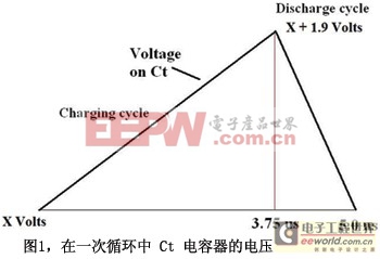陡升的波形相当于对电容器的放电,而缓降的电流波形表示对电容器充电。下一步将检查容差的影响。高低转折点电压变化都很小。较高的转折点电压会造成更长的充放电时间。这会降低转换器转换频率,进而引起运行的变化,但是最大的占空比保持不变,因为充放电的斜率保持不变。同样,较低的转折点电压会造成频率上升,因为Ct电压可以更快地到达较低电压转折点。