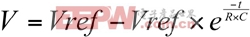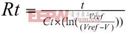 我们根据两个已知的电压:V值 的变化量为1.9V和5.0V 的 Vref ,以及 3.75ms的时间,得出Rt为: