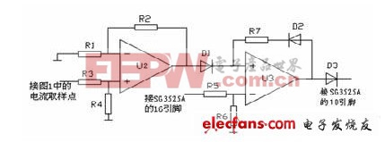 如图6所示,运放U2及外围电阻构成反比例放大器,运放U3及外围电路构成比较器。图1中的R3为取样电阻,取2.2Ω,2W。当负载电流增大时,该电阻的压降△U增大。
