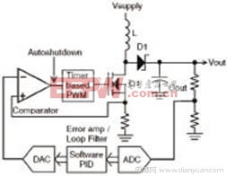 随着电感内电流的形成,占空比计数器将继续向上计数。如果电感电流先达到期望值,比较器将终止脉冲,电感开始向输出电容放电。如果PWM计数器先达到特定的占空比值,比较器将终止PWM脉冲。该方法在模拟和数字两个领域都达到了最佳效果——既可以得到一个不需要高MIPS处理器的快速电流模式反馈,又可以具有设定最大占空比来限流的能力。