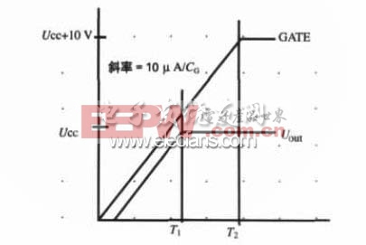 当电源首先作用到UCC引脚时,功率MOSFET栅极电压被拉低,一旦UCC升高并大于设定的欠压锁定阈值1.244V,LTC4350的UV引脚发挥作用。如果UV引脚电压大于1.244V,外接功率MOSFET栅极开始由10μA的电流充电,GATE 引脚电压开始以斜率10μA/CG缓慢上升(如图2所示),这个缓慢充电过程允许电源输出在不受干扰的情况下平稳接入负载。而当电源断开时,UV 引脚电压将低于1.22V,LTC4350迅速将外接功率MOSFET栅极放电,使负载与电源之间断开,这样就实现了LTC4350本身的热插拔功能。