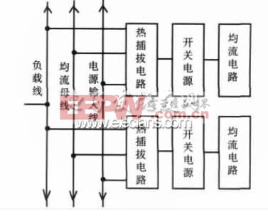 图3所示为两块并联工作的电源模块方框图,每个电源模块都有自己的热插拔电路设计、开关电源以及均流电路,并联工作的模块间享有公共的均流母线、负载线、电源输入线Uin以及模块故障状态告警线STATUS。