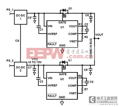 在两组或多组电源模块输出回路中,各串接二极管后并联连接,使得当单一模块产生异常时,其它模块可接续提供电源,维持系统工常运作。其中二极管应选择低顺向导通电压降(Low Vf),以降低导通损失。