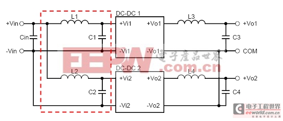 在一电源系统中,若同时使用多组电源模块,且输入端使用同一电源时,为防止二组或多组电源模块之间的交互干扰,形成系统所不乐见的EMI问题,甚至造成系统误动作的谐波,此时,可在电源系统前端与EMI filter之间加入L1、C1、L2与C2来减低电源模块之间的交互干扰。
