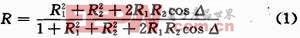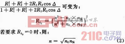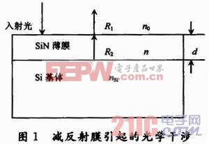 如图1所示膜有2个界面就有2个矢量,每个矢量表示一个界面上的振幅反射系数。如果膜层的折射率低于基片的折射率,则每个界面上的反射系数都为负值,这表明相位变化为180°。当膜层的相位厚度为180°时,即膜层的光学厚度为某一波长的1/4时,则2个矢量的方向完全相反,合矢量便有最小值。如果矢量的模相等,则对该波长而言;2个矢量将完全抵消,于是反射率为零。镀制有减反射薄膜的太阳电池的反射率R为: