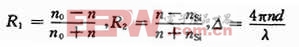 式中:R1,R2分别为外界介质与膜和膜与硅表面上的菲涅尔反射系数;△为膜层厚度引起的位相角。其中: