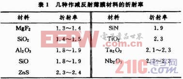 几种能够作为减反射薄膜的材料和它的折射率列在表1中,可供参考:
