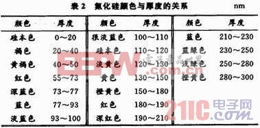 由于氮化硅的折射率为1.9,是很理想的减反射膜材料,所以研究中采用的就是这种材质的减反射膜。氮化硅薄膜的折射率高,其中晶态氮化硅薄膜的折射率为2.0;非晶态氮化硅薄膜的折射率会在其左右一定范围内波动。氮化硅薄膜的厚度和颜色有对应关系,如表2所示。