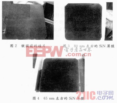 厚度可用椭圆偏振仪精确测量。在能够估计厚度范围的情况下,可根据氮化硅薄膜的颜色和表中所列的颜色进行比较,以此来确定氮化硅膜的大约厚度。图2~图4分别为镀膜前、80 nm左右SiN薄膜和65 nm左右的SiN薄膜图示。