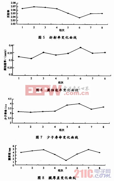 (4)温度对薄膜的各个参数影响都不大。温度上升,折射率增大(见图5),腐蚀速度下降(见图6)。