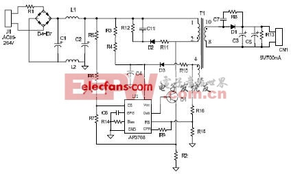 AP3768 中采用了随机频率调制技术,并且系统的变压器采用了特有的线圈屏蔽绕法,省去了通常采用的铜皮屏蔽,获得了良好的效果,也降低了变压器成本。