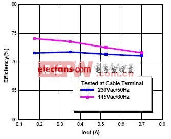 AP3768 的工作电流只有300uA,而且在轻载时,采用了线性降低工作频率的方式,降低了轻载时的开关损耗,因此,AP3768 的系统很容易满足能源之星2.0的效率标准。图4 为AP3768 系统输出线端的效率测试结果。在AC 115V 输入时,系统的平均效率为73.0%,在AC 230V 输入时,系统的平均效率为71.5%,超出了能源之星外部电源2.0 的能效标准6%。