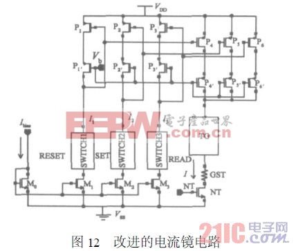考虑如图12所示的电流镜,该结构采用共源共栅的改进结构,可得到更精确的驱动电流,并且将选通管源端接地(不同于图10中的情况:选通管的衬偏效应限制了能流过相变单元的最大电流,故其尺寸需要设计的较大些),图12中选通管的衬偏效应得以消除,可仅用较小的选通管尺寸得到相同的效果,这种结构将在1Mb容量的PC2RAM芯片中得以运用。